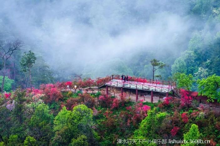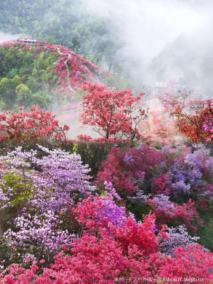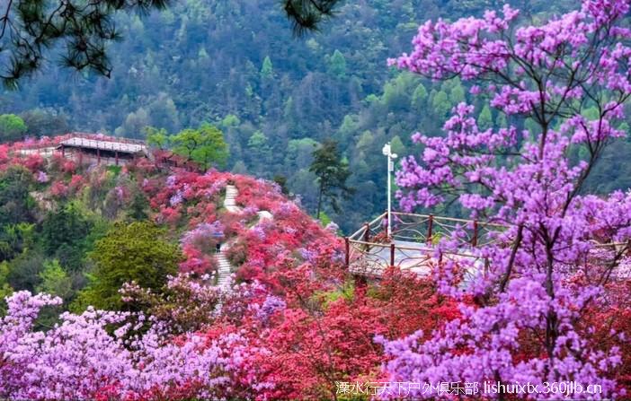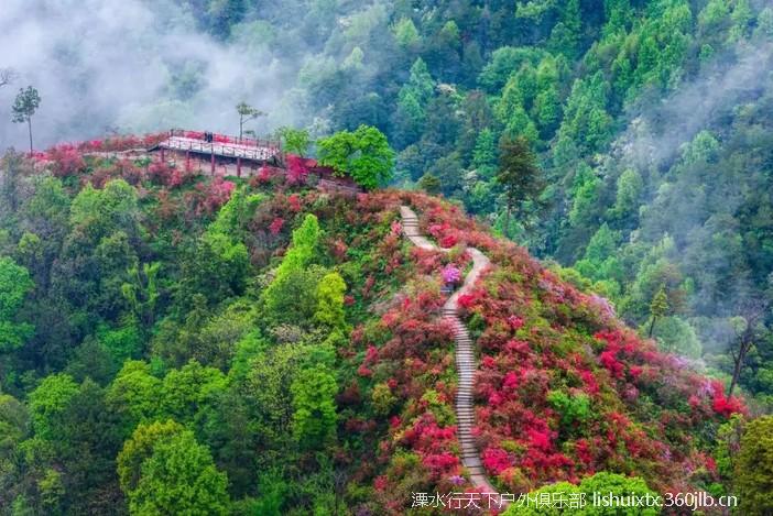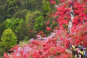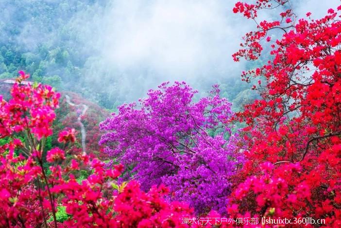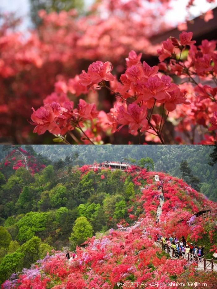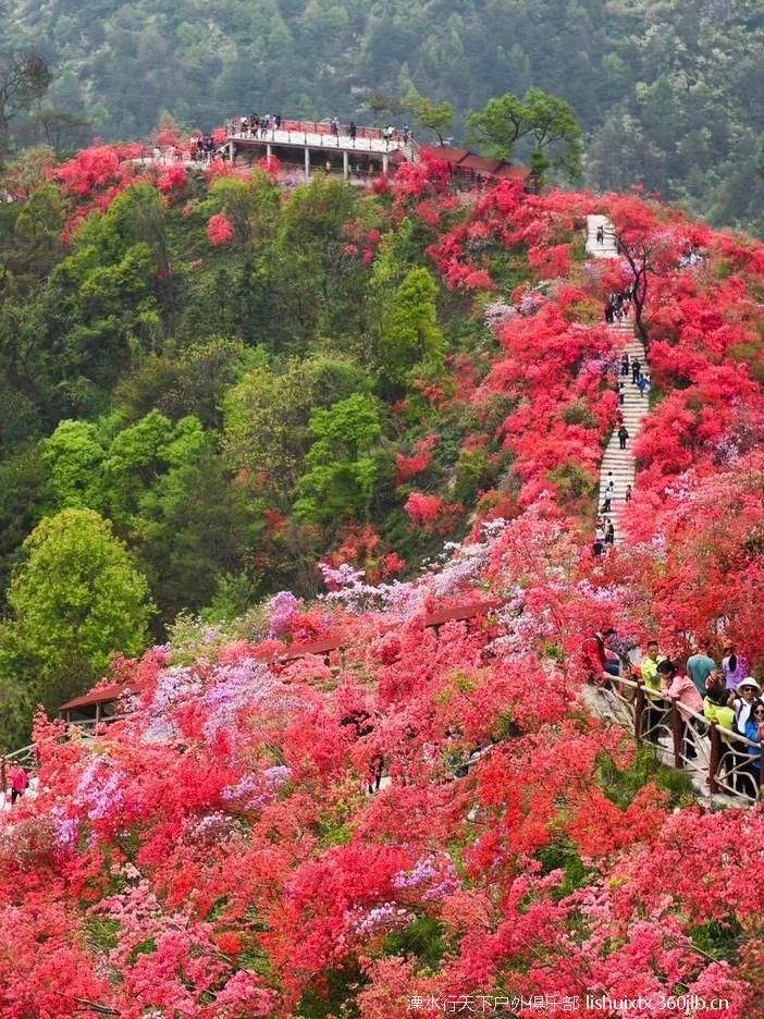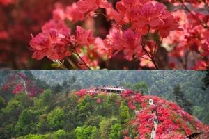 ![]() 从景区而入,迎面而来的是千米映山红长廊 沿着崖壁蜿蜒下山步道,穿行在原始丛林中 曲曲折折,一路向下 你会看到火红火红的映山红在青山绿树之间云蒸霞蔚 一团团一簇簇,开得那么热烈,那么绚丽 |
